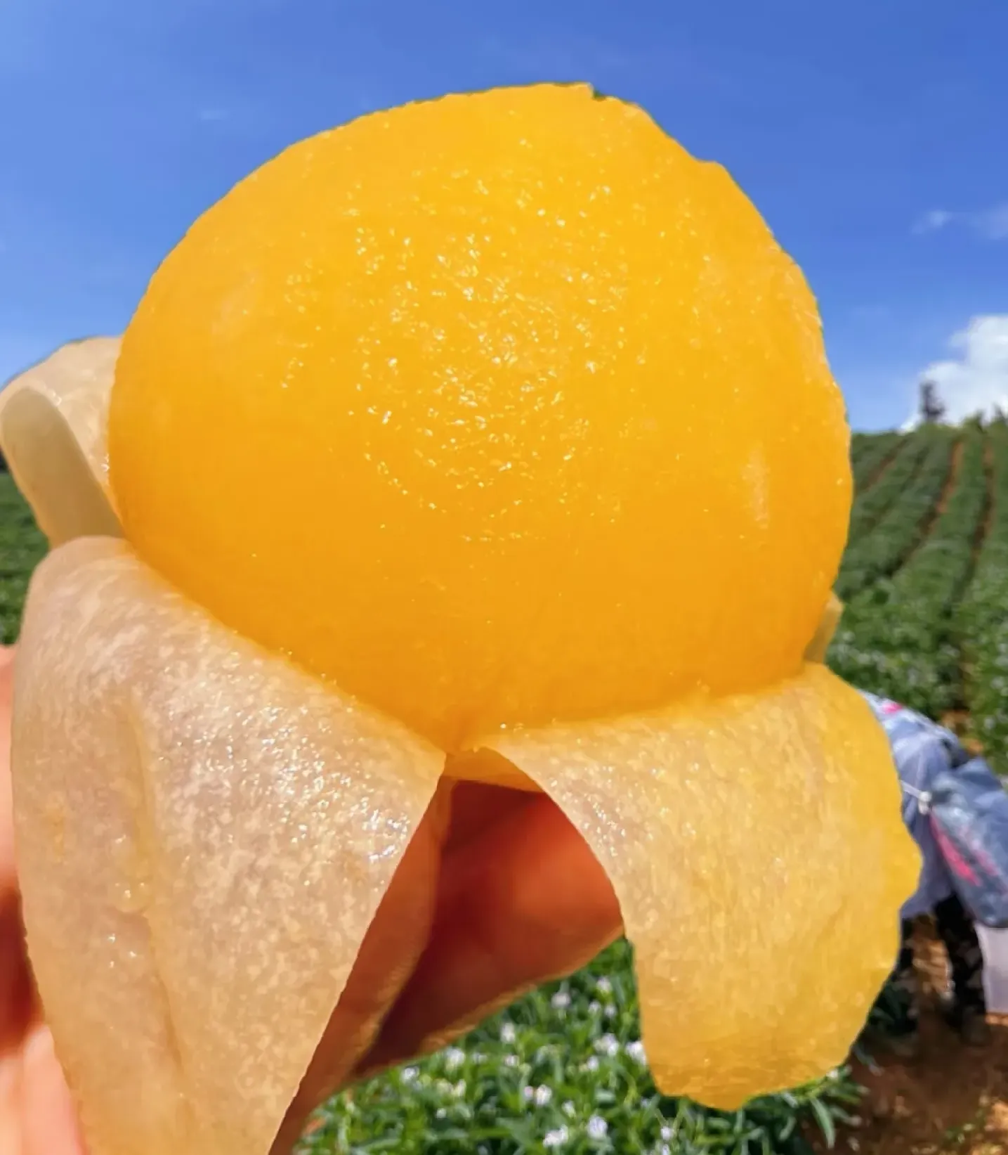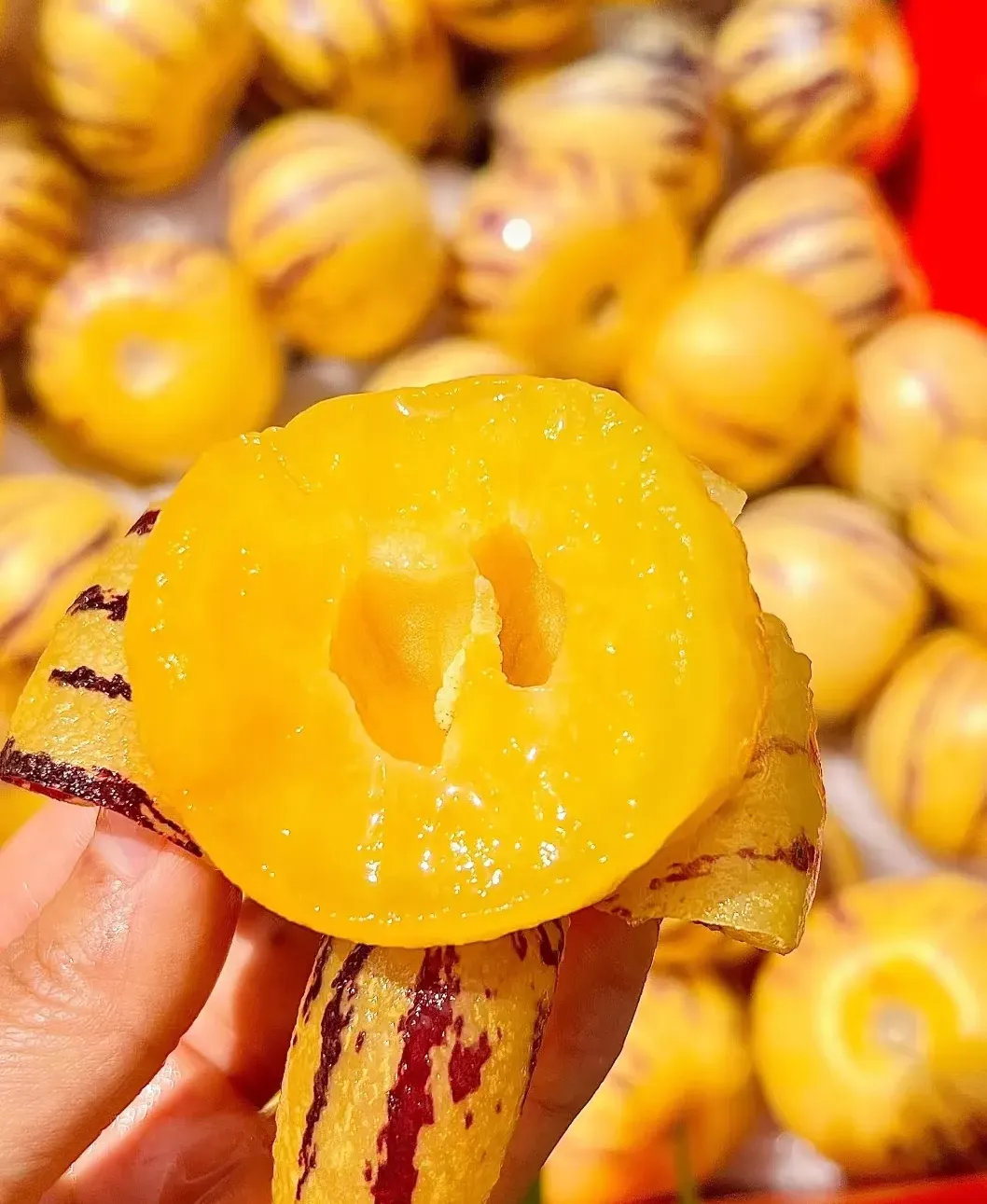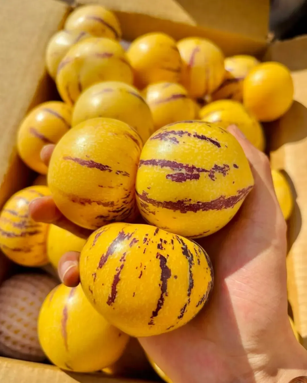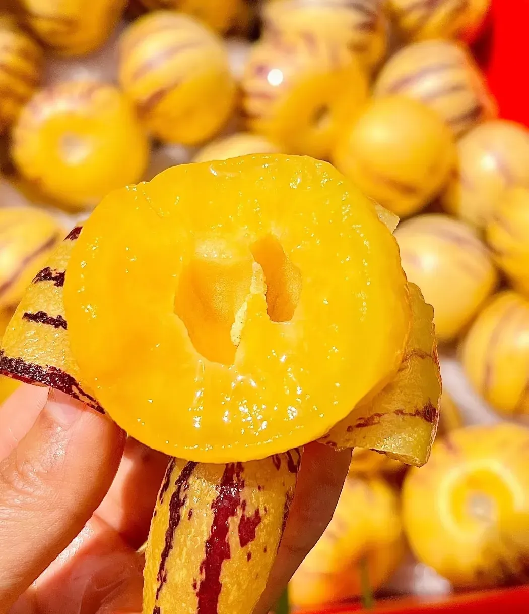 Každý plod má jedinečný oválny tvar s hladkou šupkou a fialovými či žltými pruhmi ✨. Dužina je jemná, šťavnatá a príjemne sladká – dokonalá kombinácia chuti medového melónu a uhorky 🍈🥒, ktorá vám prinesie doteraz nepoznaný chuťový zážitok.